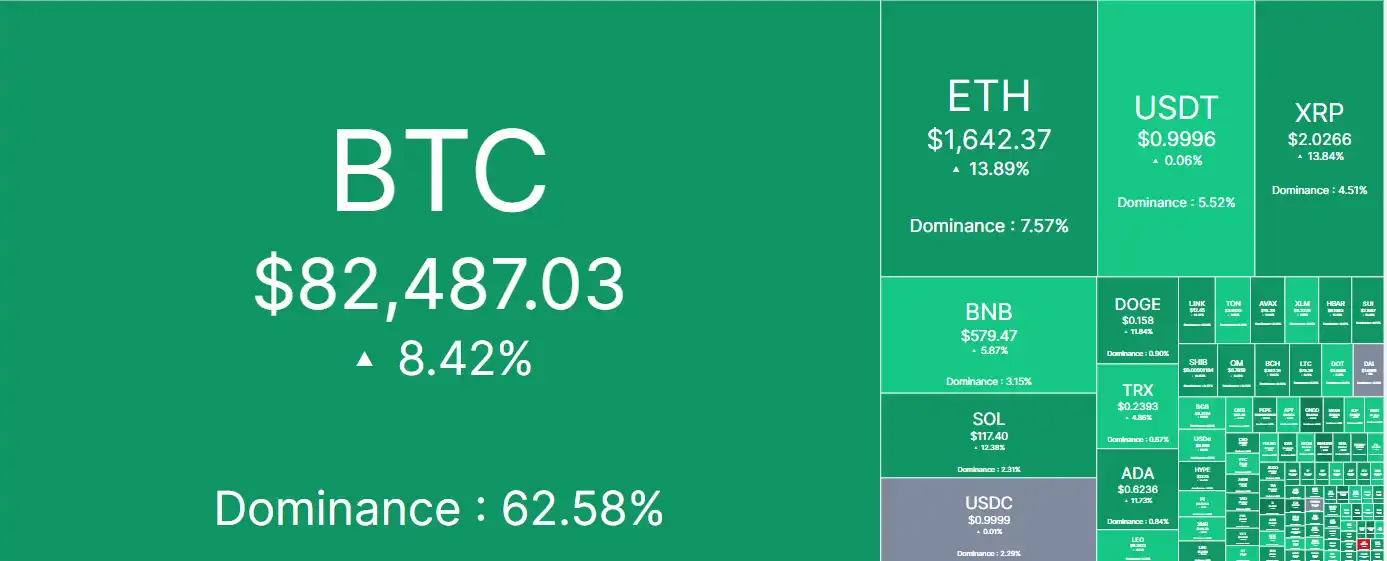 加密市场也应声回弹,据 CoinMarketCap 统计,比特币 24H 内上涨 8.42%,站回 8 万美元,以太坊 24H 内上涨 13.89%,当前报价 1642 美元,SOL 在 24H 内上涨 12.38%,目前在 117 美元左右。其他主流山寨币涨幅更大,XRP、AVAX、SUI 等代币在 CoinDesk20 指数中均上涨超过 10%。部分 Solana 生态 meme 币反弹,VINE 24 小时涨幅达 44.6%,FARTCOIN、POPCAT、GHIBLI 等 meme 币反弹均在 50% 左右。