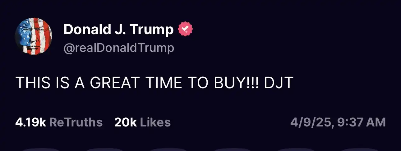 狼来了的假消息听多了,真消息就算显露出蛛丝马迹,市场也很难做出大的反应。在美股开盘后不久,特朗普曾在 Truth Social 上发文,让大家「保持冷静」,随后补充称「现在是买入 DJT 的好时机」。看到这些煽动性文字,投资者们大概第一时间想到的是前几日特朗普的另一「暴论」——只要不卖出,就没有亏损。