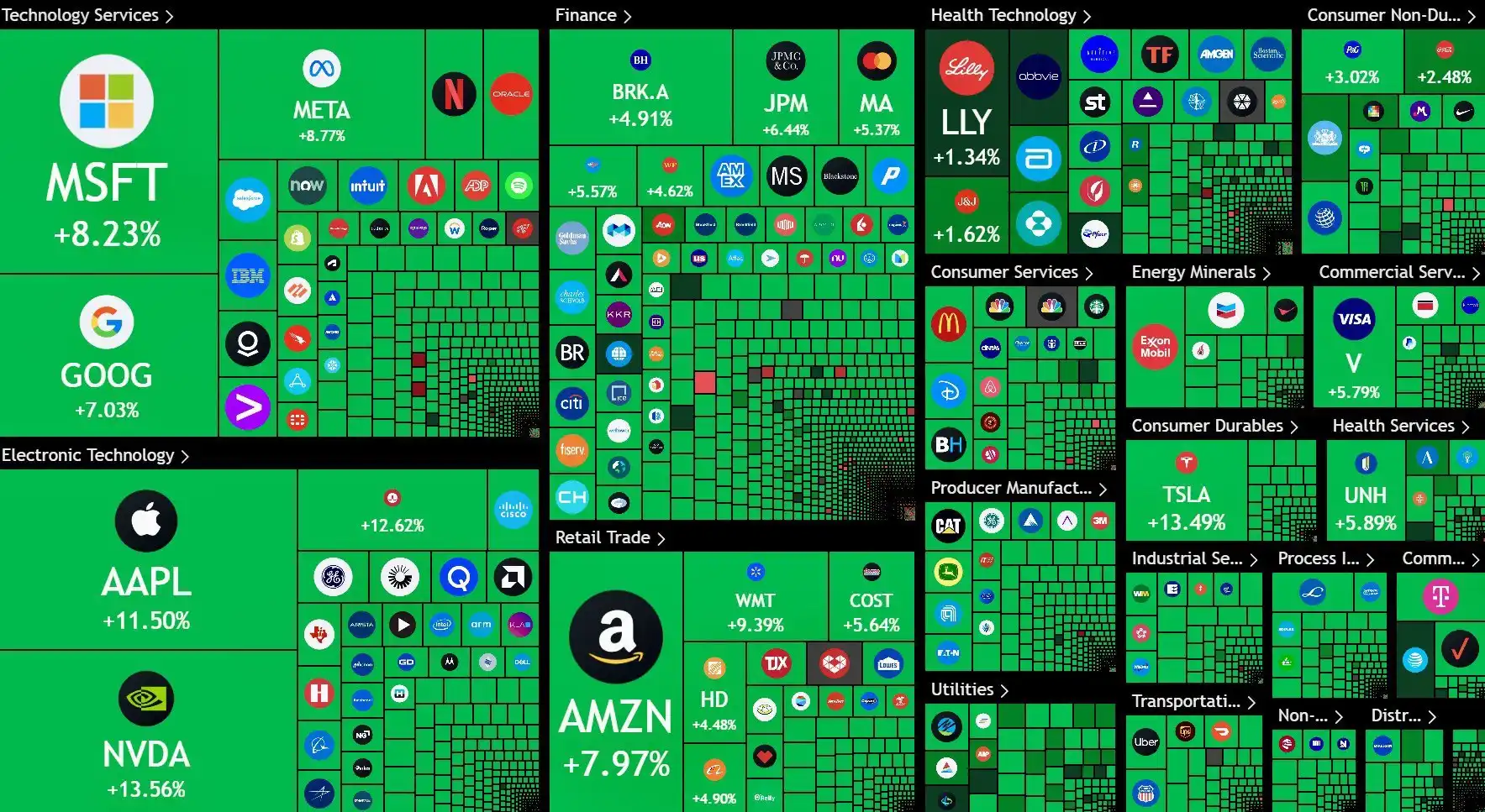 在特朗普发布这条消息后,连跌几日的股市终于迎来喘息和回调的机会,标准普尔 500 指数几分钟内上涨逾 9%,大幅扭转了连跌数日的颓势,成为自 2008 年金融危机复苏以来,标普 500 表现最好的一天,美股市值也在 10 分钟内暴增 4 万亿美元。美股科技巨头全线暴涨,总市值在短短几小时内增加了 1.85 万亿美元。