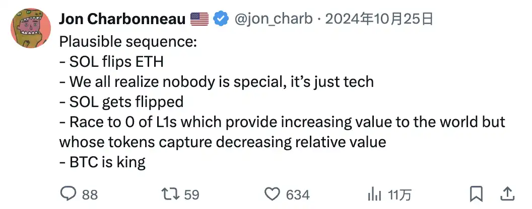 可能的发生的一系列: · SOL 超越 ETH · 我们都意识到没有谁是特殊的,只是技术 · SOL 被超越 · L1 的价值为世界提供越来越多,但其代币捕获的价值相对减少 · BTC 称王