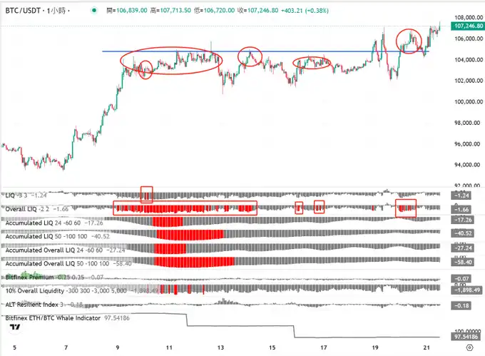 而「以涨代跌」的理解则是,主动买盘一直存在,连续冲击卖单墙,使 105000 关键位置的挂单越来越少,直至被完全吸收。因此价格继续向上运行的时候,LIQ 反而出现了改善的现象。