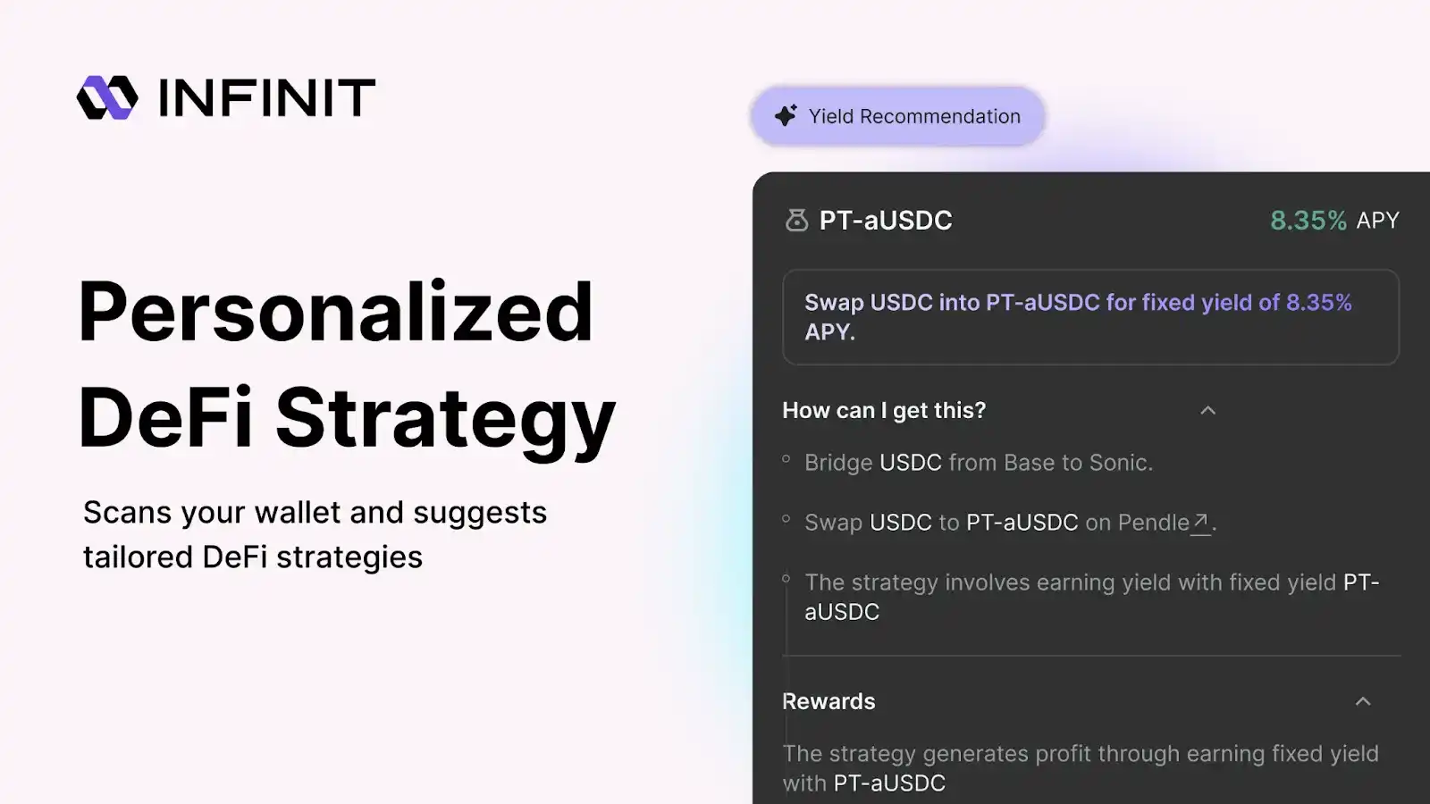 INFINIT Intelligence 是 INFINIT 应用背后的全新 AI 引擎,将其转变为每位用户的专属 DeFi 助手。它能够学习分析用户钱包资产,理解用户的目标、意图与风险偏好,结合多维度的链上与链下数据,生成契合用户个体需求的定制化 DeFi 策略。