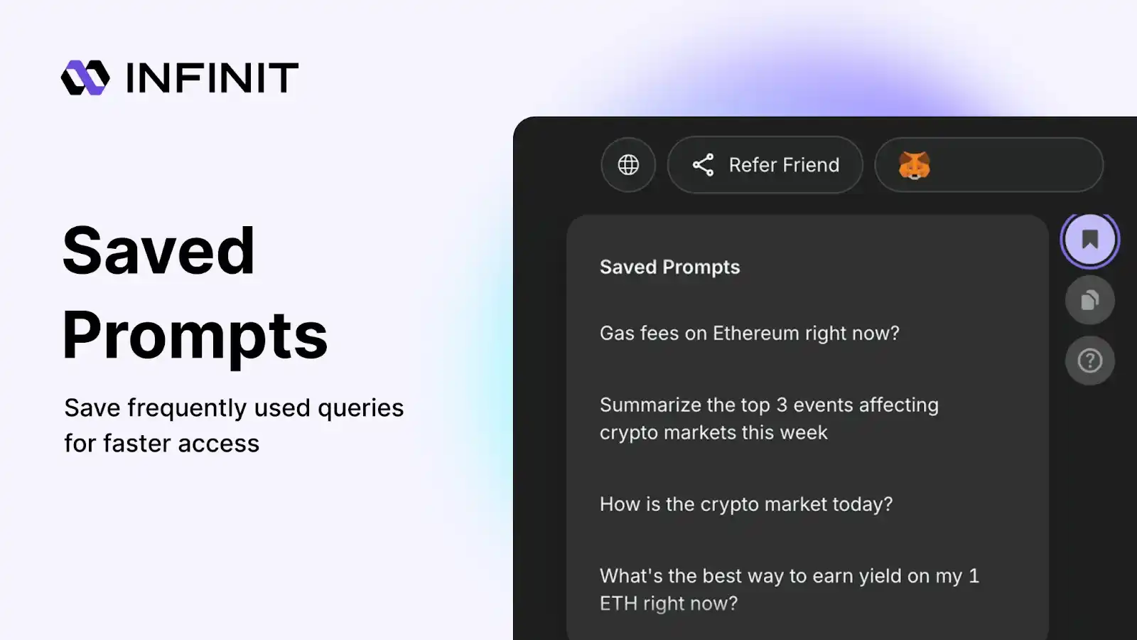 此外,为了提升重复操作与研究效率,INFINIT 引入了「保存提示(Saved Prompts)」功能。你可以将高频使用的问题保存下来,例如「今天 DeFi 有哪些热门趋势?」或「Arbitrum 上最佳稳定币收益池」,以后随时调用。