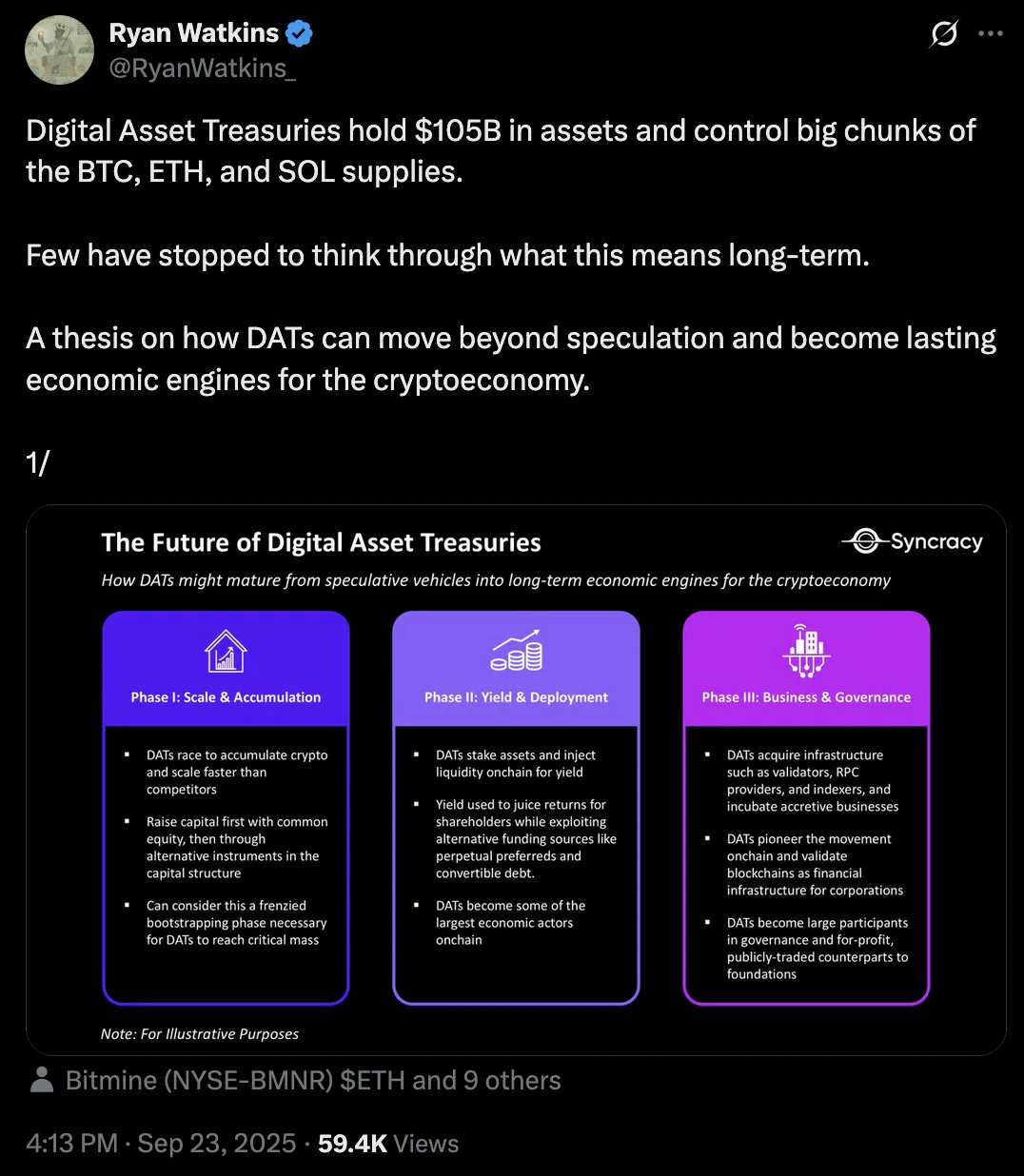 Syncracy Capital 联合创始人 Ryan Watkins 指出这些公司总共持有约 1050 亿美元的代币,而他们如何使用这些资产正在改变游戏规则。