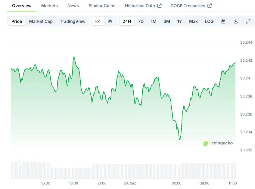 狗狗币(DOGE)继续在窄幅区间内交易,挣扎于阻力位在 0.245 美元附近,支撑位在 0.232 美元附近当前狗狗币(DOGE)的技术分析表明,其势头正在减弱。由于缺乏更新或生态系统发展,DOGE 高度依赖市场情绪,尤其是散户驱动的新闻和社交媒体推广。