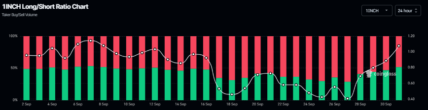 在衍生品方面,交易员对 1INCH 的看涨押注正在向月度高点攀升。下方 CoinGlass 图表显示,周三 1INCH 的多空比为 1.08,表明交易员押注该资产价格将上涨。