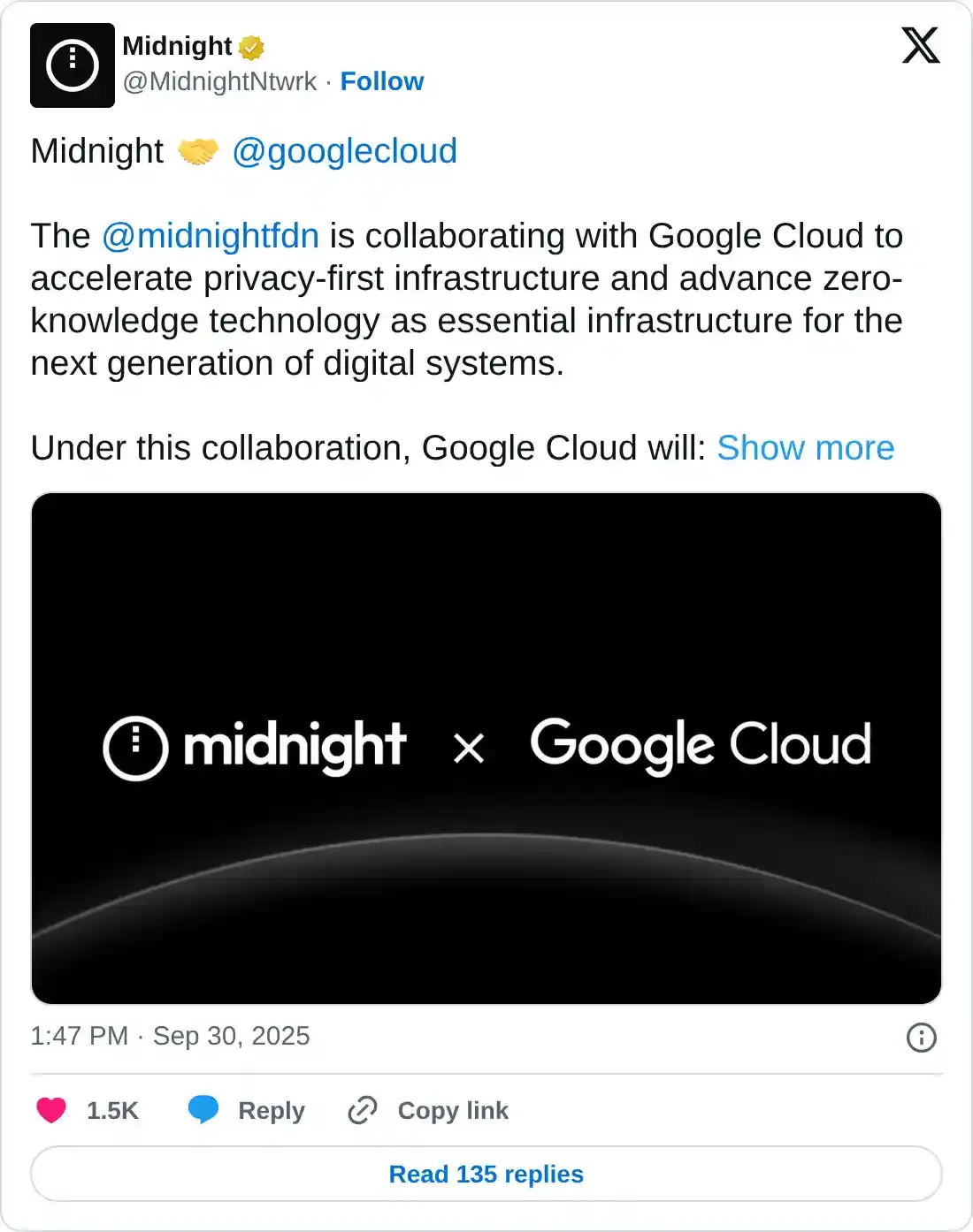 - Midnight Network 宣布与 Google Cloud 合作,以增强隐私优先和零知识数字系统。
