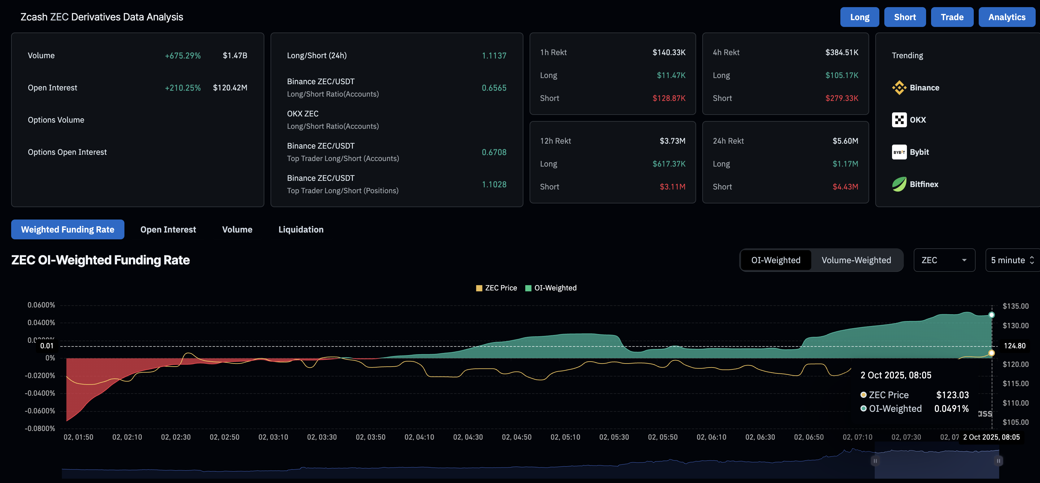 CoinGlass 数据显示,过去 24 小时内 ZEC 未平仓合约 (OI) 增长逾 200%,达到 1.2 亿美元,表明大量资金流入 Zcash 衍生品。OI 加权融资利率已从当日早些时候的 -0.0711% 转为正值 0.0491%,这验证了风险偏好情绪。