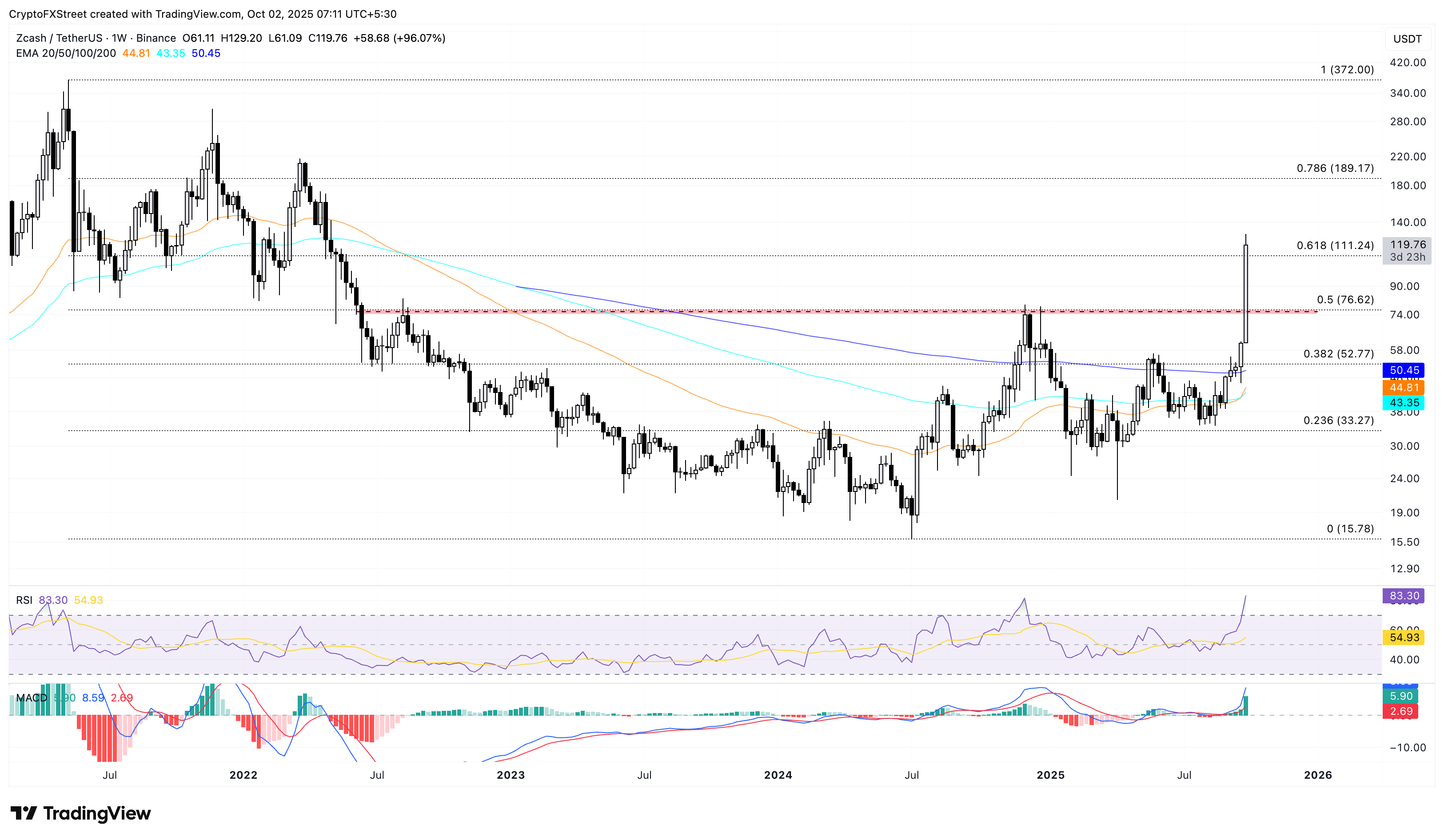 ZEC 突破了 111 美元的 61.8% 斐波那契回撤位,从 2021 年 5 月的 372 美元高点回撤至 2024 年 7 月的 15 美元低点。若果断收于该水平上方,则可能延续涨势至 189 美元的 78.6% 斐波那契回撤位。