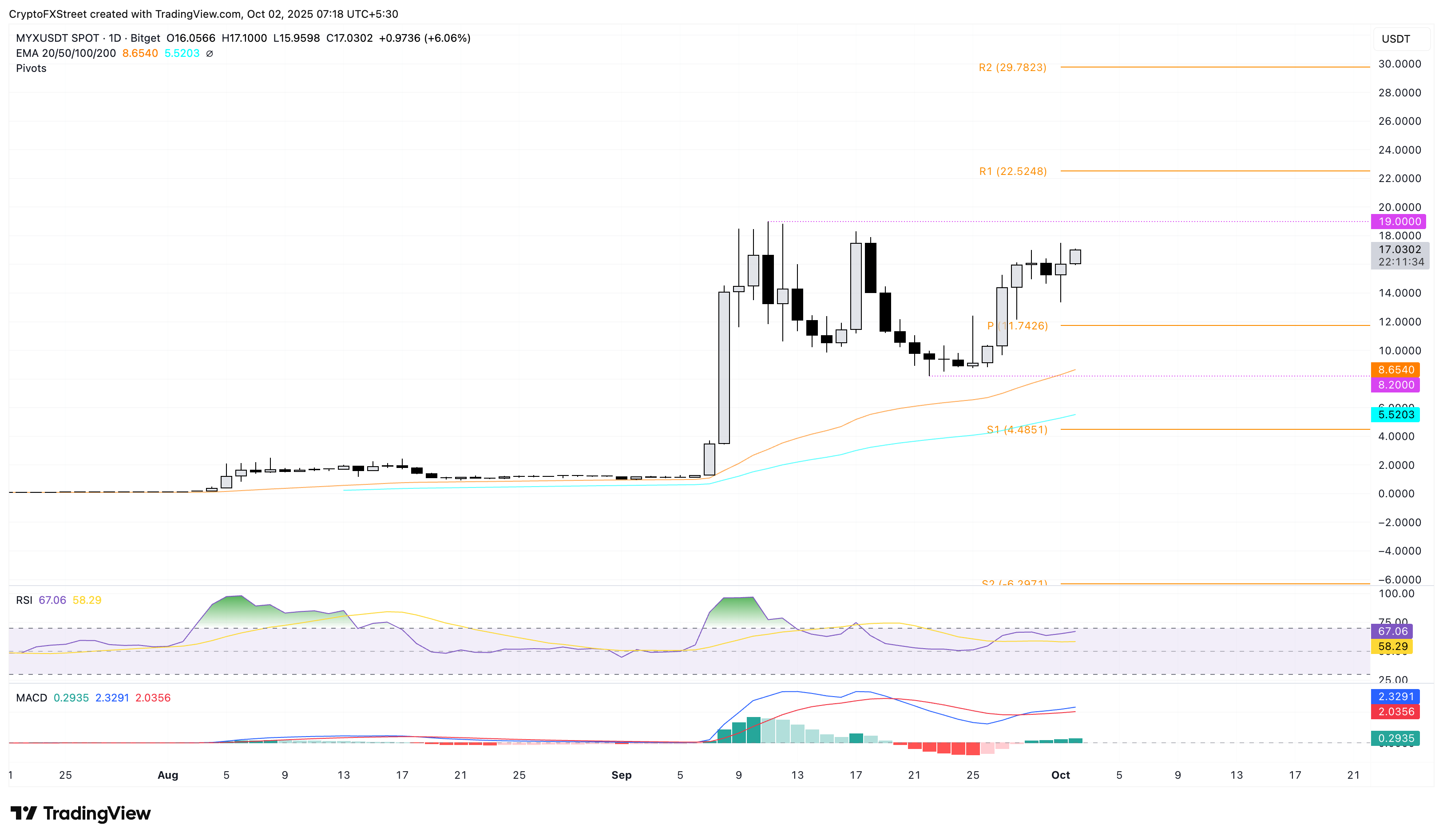 MYX Finance延续了9月22日8.20美元低点以来的反转走势,目前正逐渐接近19.00美元的历史高点。截至本文撰写时,MYX周四上涨近3%,此前一天上涨了5%。