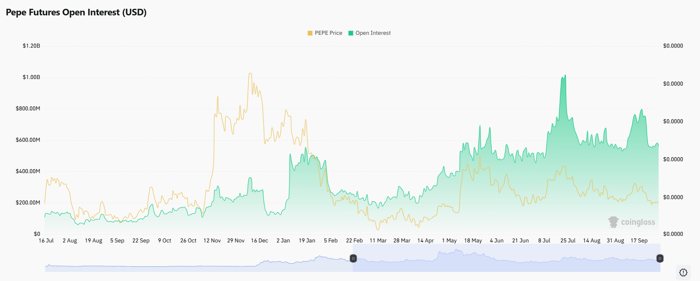 PEPE期货产品的未平仓合约稳步攀升。CoinGlass数据节目期货未平仓合约目前接近6亿美元。该指标追踪未平仓期货合约的总价值。