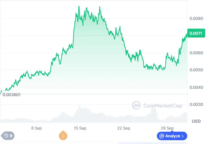 据 10 月 1 日报道,PUMP 在 24 小时内上涨超过 10%,价格达到 0.007000 美元。CoinMarketCap.