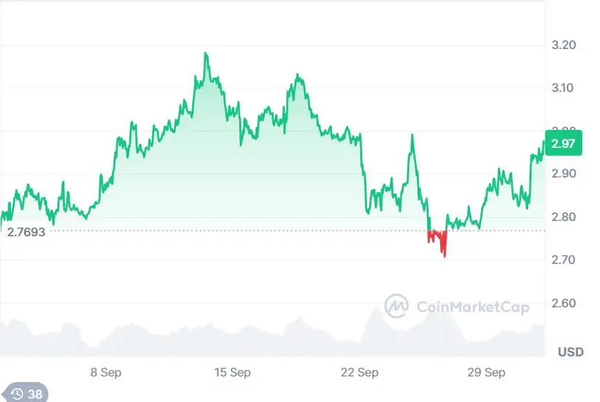 10 月 1 日,XRP 交易价格在 2.90 美元左右,呈明显上升趋势。CoinMarketCap.