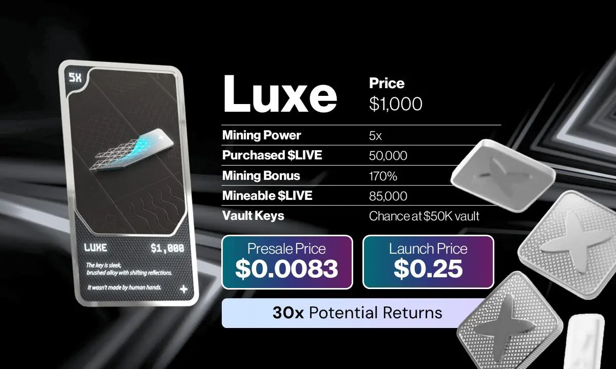 预售中内置的 250 万美元大赠送更是锦上添花。每个代币和 NFT 礼包都包含一把钥匙,可以解锁多个数字金库之一,奖励从少量 $LIVE 到最高 100 万美元不等。售价 1,000 美元的 LUXE 礼包,买家可以访问最高价值 50,000 美元的 $LIVE 代币金库,这大大提升了代币收益以外的潜力。