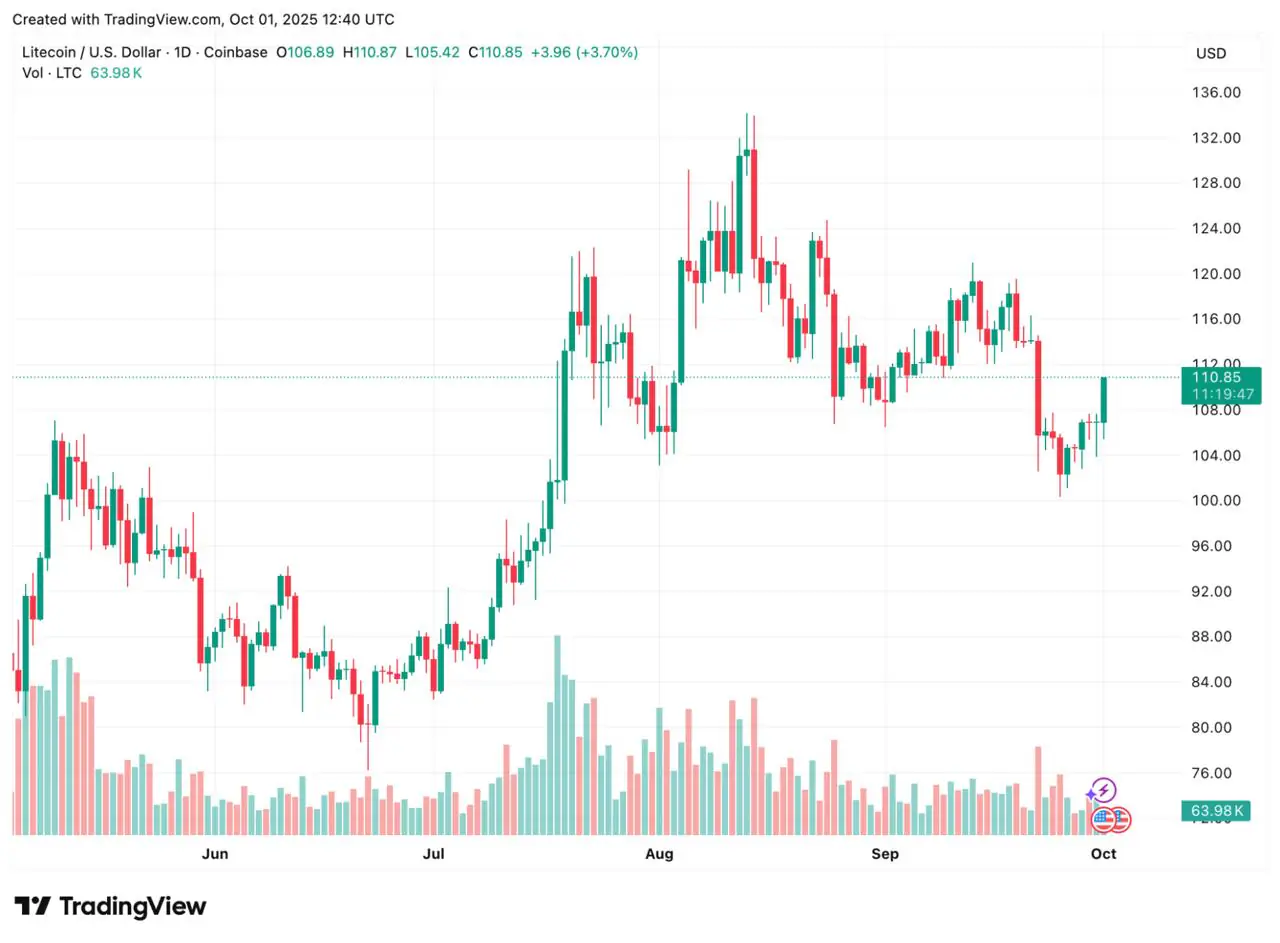 " >ETF。该代币于8月13日达到134.30美元的峰值,并在9月份跌至100美元的低点,随后反弹至106.75美元。技术图表显示,头肩形态正在形成,头部位于134美元,肩部位于121.35美元。颈线位于107美元,价格近期已重新测试该价位。目前,莱特币已跌破50日加权移动平均线,预示着看跌突破。分析师认为,如果这种模式持续下去,莱特币可能在未来几周跌向90美元的关键支撑位。然而,由于“谣言买入,新闻卖出”的局面,ETF的批准可能会暂时推高价格,之后可能出现回调。