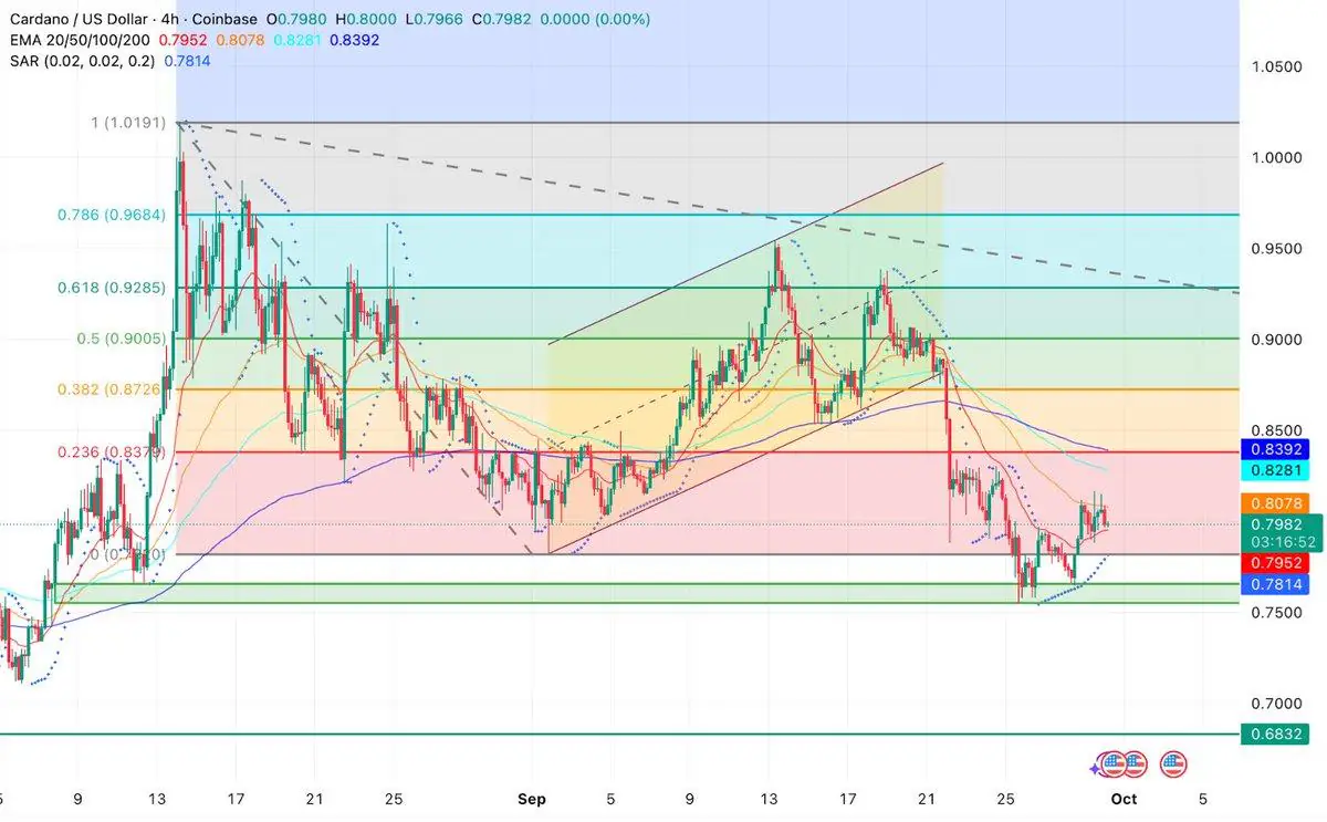 技术面来看,ADA 已守住长期支撑线,突破关键三角形和下降通道形态,收盘价高于修正通道,预示着其将转向看涨结构。价格在 0.80 美元附近盘整,强劲的底部和持续的买盘压力可能推动其向 0.90 美元的阻力位迈进。