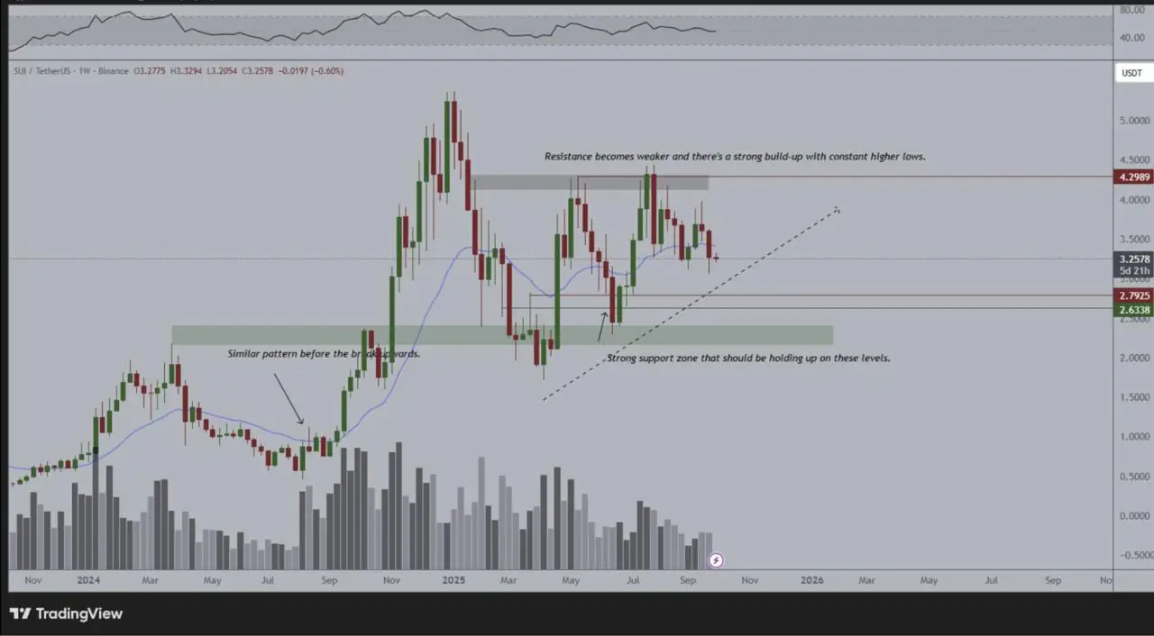 SUI 是项目圈中最常讨论的山寨币之一。目前 SUI 价格在 3.25 美元左右,正在窄幅震荡,但一旦确认突破 3.75 美元,则可能预示着其将上涨至 5.00 美元。