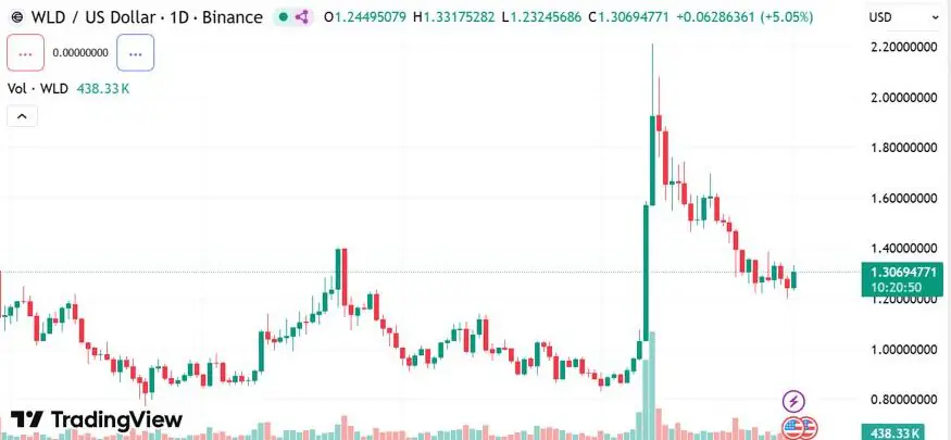 Worldcoin 的价格在大幅回调后回落至 1.3 美元附近。身份加支付的故事仍然吸引着大笔资金,而且链上