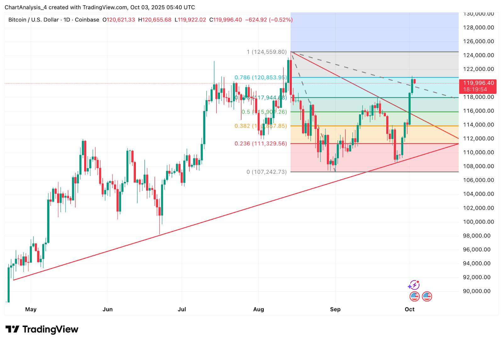 比特币今日交易价为 119,996 美元,在从 111,000 美元爆发性上涨后,目前在 120,800 美元阻力位下方盘整。此次反弹已使 BTC 重回数周来最高水平,但其动能面临 0.786 斐波那契回撤位和下行趋势线的关键考验。