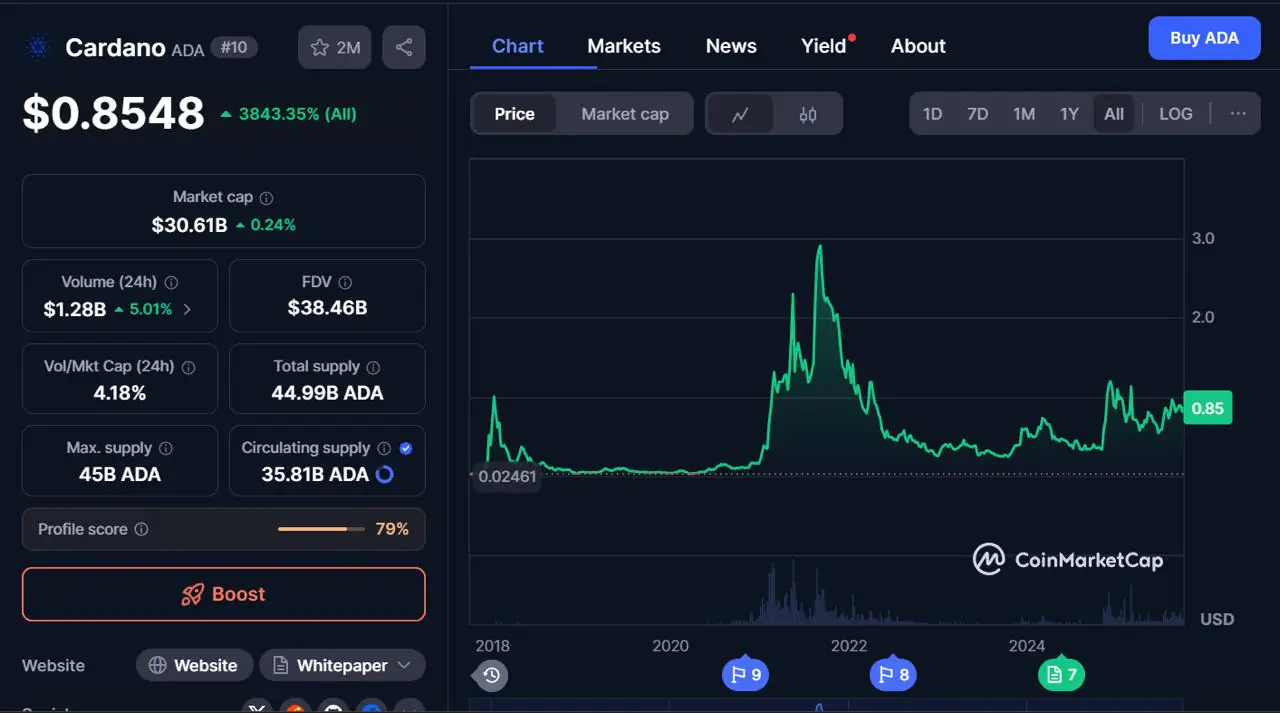 卡尔达诺 (ADA) 在突破重要支撑位后,无疑吸引了所有人的目光。该代币从 0.75 美元的低点反弹,此前曾一度挑战 1.00 美元的高点,目前交易价格约为 0.8543 美元。此次反弹伴随着下降楔形形态的突破,这种形态通常预示着趋势反转。分析师指出,如果 ADA 突破 0.9614 美元,短期内有望飙升至 1.20 美元。