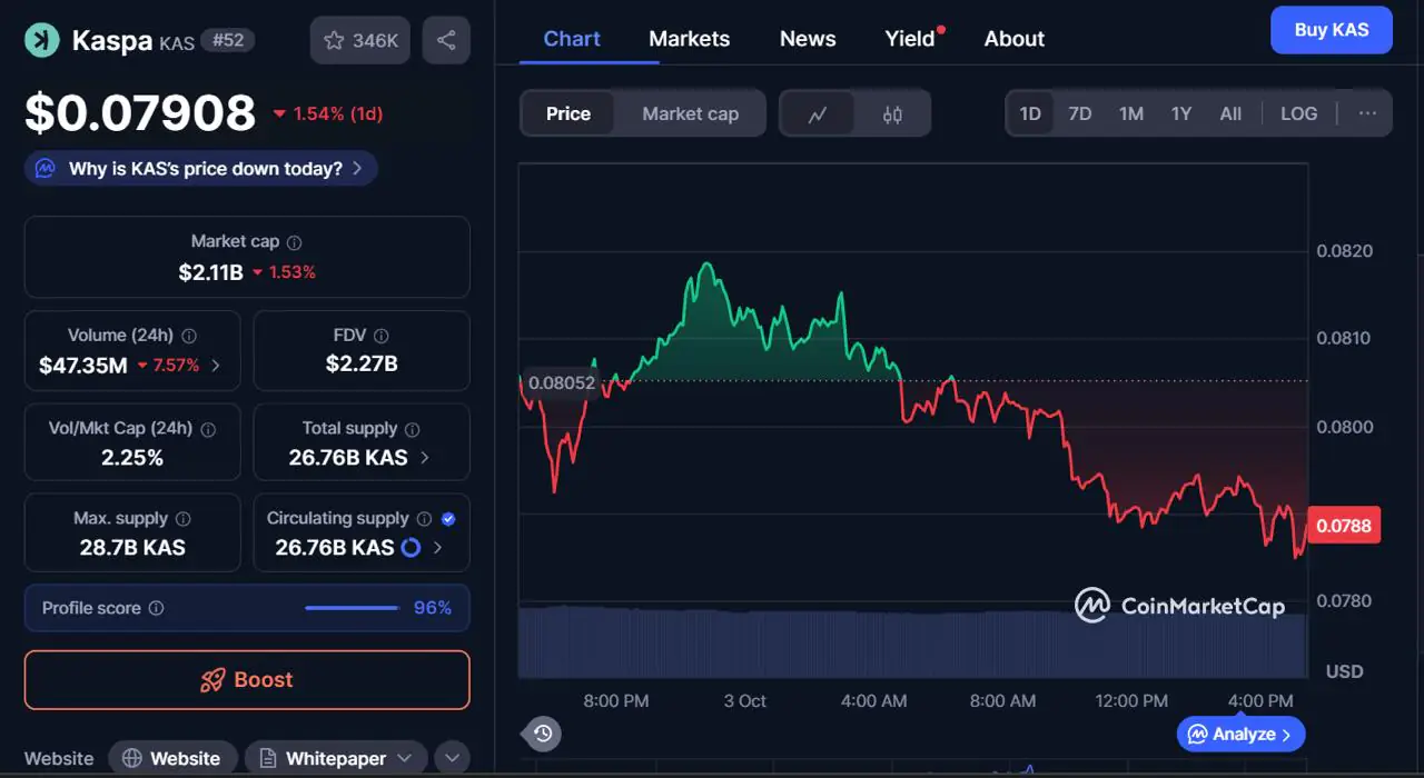 Kaspa 的技术前景也看起来乐观。该代币已突破 20 和 50 指数移动平均线,这通常被视为看涨交叉。如果势头持续,分析师认为 KAS 可能会升至 0.10 美元,甚至可能达到 0.14 美元。这些信号,加上其独特的 PoW 基础,解释了为什么 Kaspa 一直出现在分析师认为被低估且具有增长潜力的山寨币名单中。