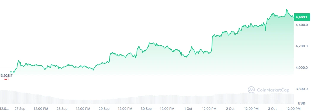 下一个热门 meme 币随着以太坊突破 4,397 美元并保持强劲势头,相关讨论也随之升温。ETH 交易价格接近 4,469 美元,市值 5,403.7 亿美元,交易量 442.8 亿美元,周涨幅 13.76%。现货 ETF 需求持续流动性