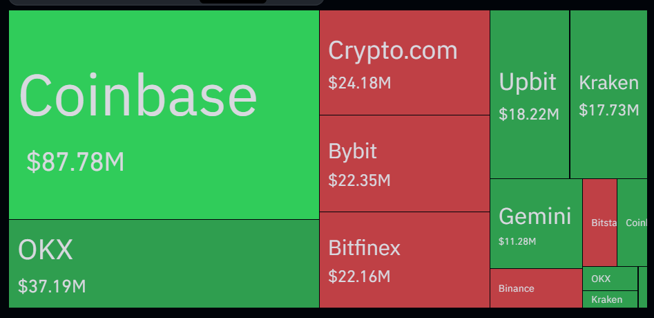 数据来自CoinGlass为现货走势提供了更多洞察。流入热力图显示,Coinbase 的流入量最大,达 8778 万美元,其次是 OKX,为 3719 万美元。与此同时,其他几家交易所也出现了资金流出,例如 Crypto.com 的资金流出量为 2418 万美元,Bybit 的资金流出量为 2235 万美元,Bitfinex 的资金流出量为 2216 万美元。