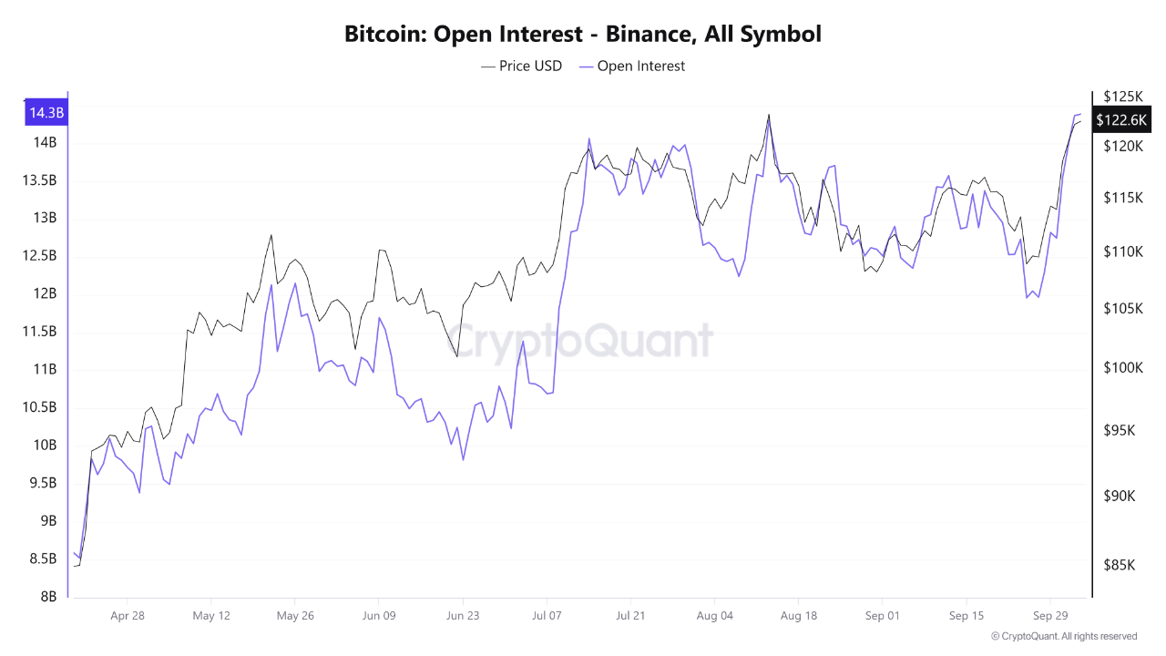 比特币的价格走势同样引人注目。最近几周,BTC 已上涨从约 108,000 美元上涨至约 122,253 美元。与此同时,未平仓合约也从 115 亿美元飙升至 140 多亿美元。