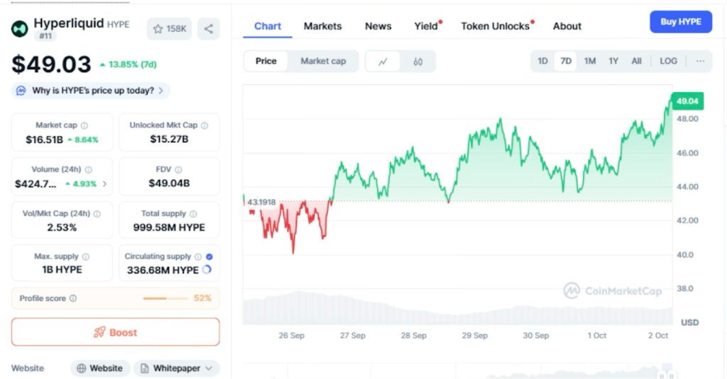 HYPE 价格在以下情况下上涨周线图上涨 13%. 徘徊在 49 美元左右,突破 30 天高点和历史高点 59 美元,不仅会成为新的高峰,还可能引发进一步的上涨。