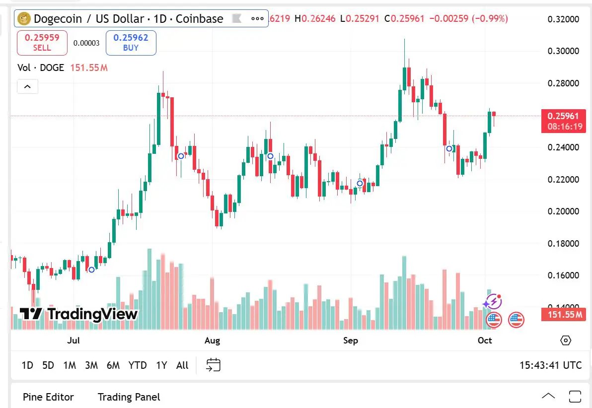目前,狗狗币的价格约为 0.2595 美元,略有下跌,过去一天下跌了约 0.63%。但更宏观的视角在于它的规模:该币的市值仍约为 386.6 亿美元。