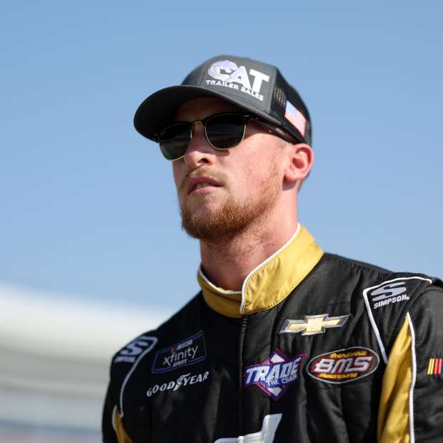 2022年10月28日,弗吉尼亚州马丁斯维尔,马丁斯维尔赛道,08号Solid Rock Carriers福特赛车手布兰登·布朗在纳斯卡Xfinity系列赛Dead On Tools 250练习赛的发车区观看比赛。(图片:盖蒂图片社)