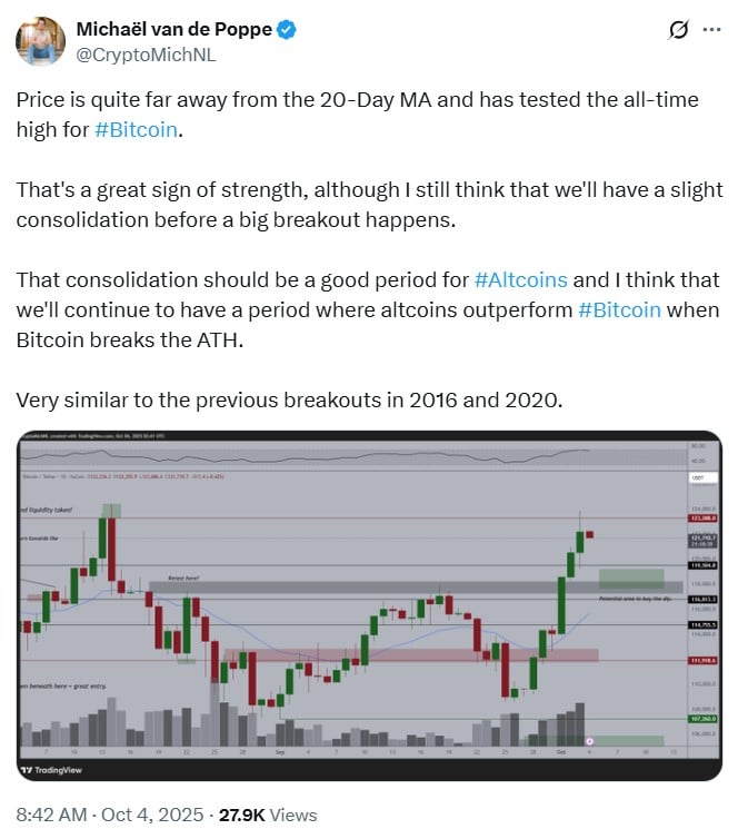 市场知名人士迈克尔·范德波普(Michaël van de Poppe)指出,比特币已经测试了之前的纪录。他预计,比特币价格将经历短暂的盘整期,之后将迎来另一轮飙升。