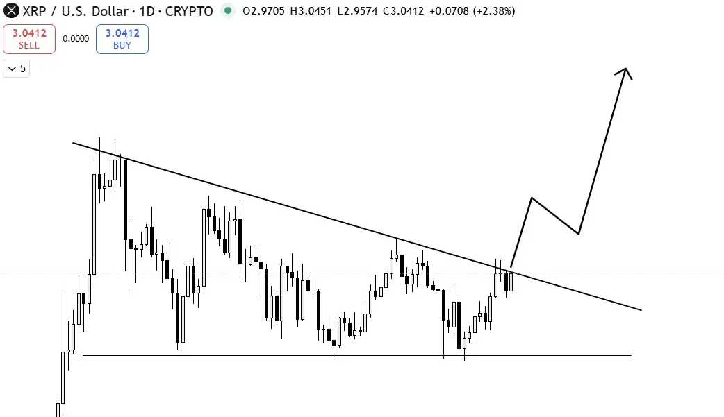 专家表示,XRP 具有很强的跟随重大技术突破的倾向。例如,早在 2017 年 3 月,XRP 就突破了类似的下降三角形形态,在不到一年的时间内,其代币价格飙升超过 35,000%。