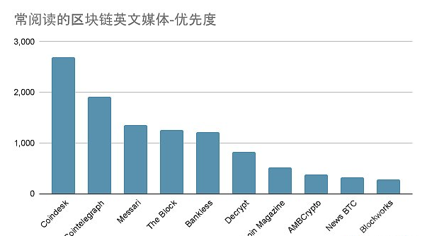 从区块链英文媒体优先选择度来看,Coindesk、Cointelegraph、Messari 位居前三,前两者优势明显。