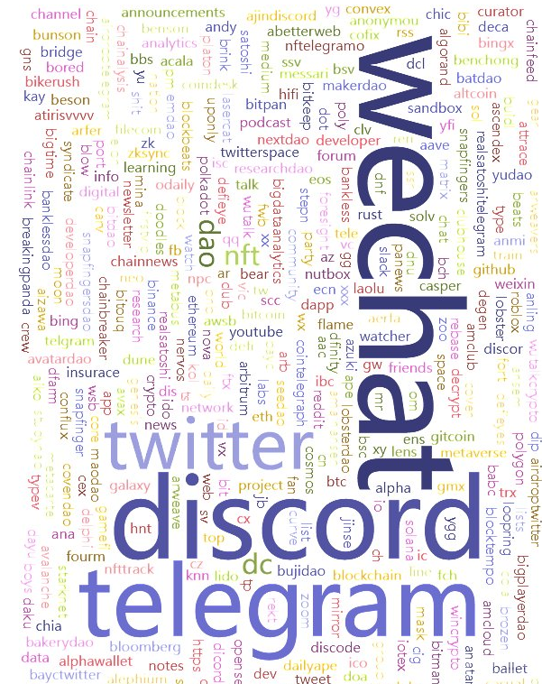 如词频图所示除渠道词汇外,其他高频词汇比较少,集中度较低。社区的主要渠道依次是:WeChat、Telegram、Discord、Twitter;而社区主题非常分散,主要涉及到媒体型社区、项目官方社区、DAO 等,之前的喊单炒币社区的词频率并不明显,主要与调研人群独立判断倾向相关。
