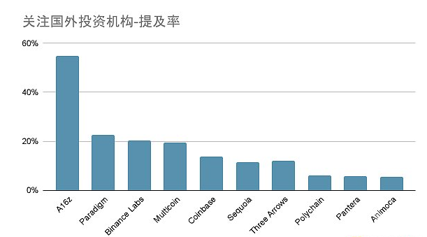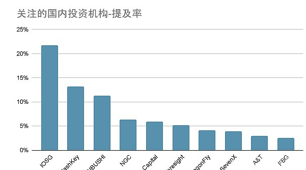 国内投资机构提及次数最多的是 IOSG,提及率 21%,其次是 Hashkey、FENBUSHI,从总的提及率来看与国外投资机构有较大的差距。