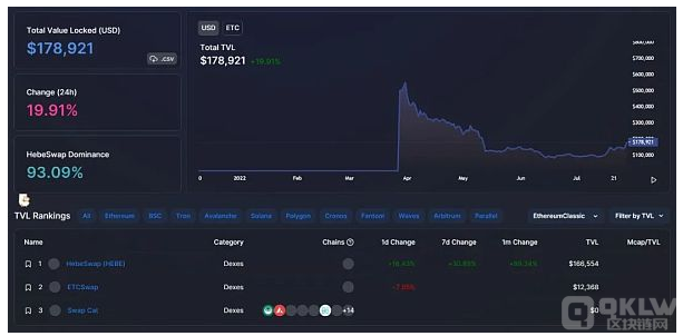ETC 的 EVM 和 ETH 是一摸一样的,毕竟这两个曾经就是一体的。只不过 ETC 网络很容易被攻击,因此 DeFi 生态一直不温不火。现在 ETC 全网 TVL 大概几十万美金吧,主要是有两个 Swap,这个量很小了可以说是。