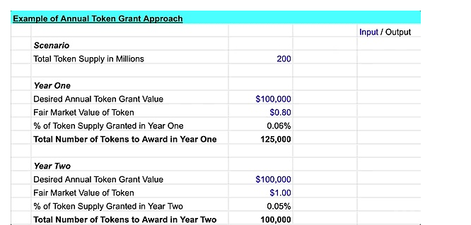你可以使用这个计算公式来决定授予多少代币。该计算公式还能让你知道每年授予的代币占你的代币池的百分比是多少。