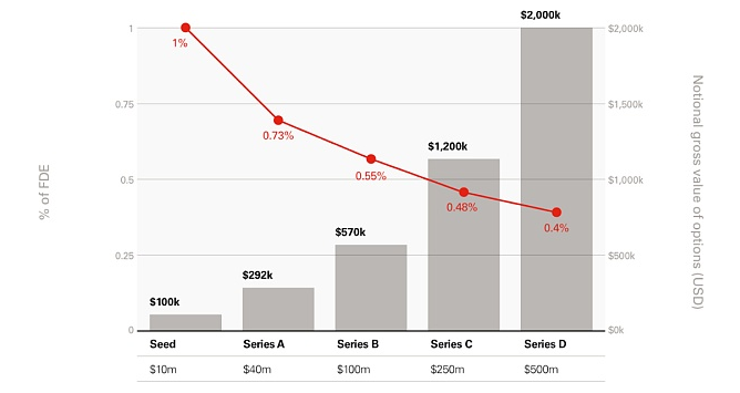 下图说明了初创企业随着时间推移所产生的股权稀释,当公司达到C轮时,员工最终可能只拥有他们最初拥有的一半所有权: