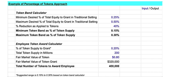 你可以使用这个计算公式,根据你研究的传统股权百分比确定你的代币百分比,以及在你想授予多少个百分比的情况下授予员工的代币数量。