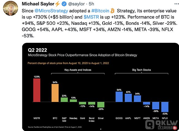 尽管如此,MichaelSaylor 在社交媒体发文称,MicroStrategy 自从采用比特币资产以来(2020 年8月),公司估值增加了730%,股价也翻了一番,比特币仍然跑赢许多传统资产。