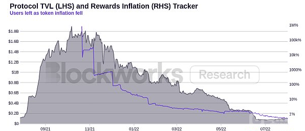 一个项目在启动后的前五个月内支付了原始分配的 14.7 倍,推动 TVL 到 2021 年创下历史新高。随着代币释放速度降至两位数的年化通货膨胀率,TVL 逃离。到第二季度末,每月奖励从每月 2000 万美元的高位下降了 99% 至 200,000 美元。