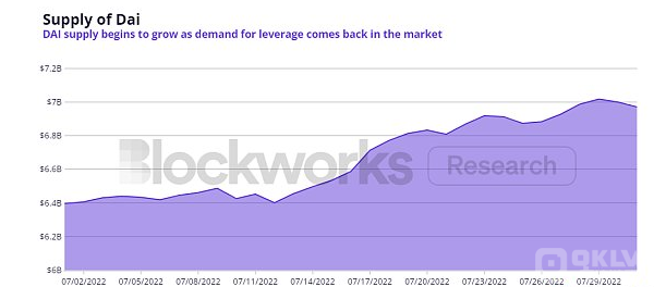 Maker 仍然是整个 DeFi 的领先协议之一,在所有 DeFi 协议中保持最多的 TVL,约为 85 亿美元。作为借贷平台,Maker 在加密货币市场对杠杆的大量需求时处于最佳状态。这通常与 DAI 供应的扩张和收缩相对应。虽然上半年 DAI 的供应量下降了 27%,但此后供应量一直在扩大。虽然 7 月初的大部分上涨是由于 PSM 的增长,但自 7 月 27 日以来,由于市场对杠杆的需求正在缓慢回升,1.5 亿美元的 DAI 已经从非稳定币抵押品中铸造出来。