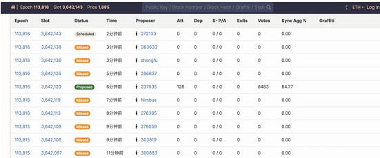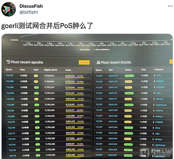 但神鱼所发布的推文也一度引发了网友的讨论,在 Epoch 时间 113787 左右,有大量区块状态为“Missed”。