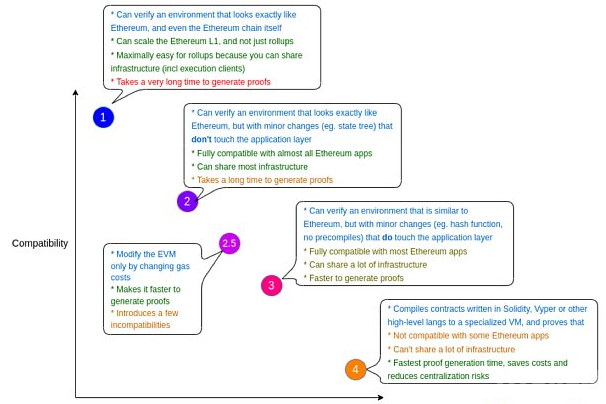 而在 Vitalik 的博文里,他将 ZK-EVM 分为几种类型。其中,类型 1 是直接在以太坊上面直接开发 ZK-EVM,这个开发过于复杂而且目前效率太低,以太坊基金正在研究中。类型 2、类型 2.5 和类型 3 是 EVM 等效的 ZK-EVM,Scroll 和 Polygon Hermez 目前处于类型 3 这个阶段,朝着类型 2.5 乃至类型 2 努力。类型 4 是高级语言兼容的 ZK-EVM,包括 Starkware 和 zkSync。这些类型并无好坏之分,而且 ZK-EVM 也没有统一的标准。正如 Vitalik 所说,“从理论上讲,以太坊不需要为 L1 使用单一的 ZK-EVM 实现进行标准化;不同的客户可以使用不同的证明,因此我们继续从代码冗余中受益。”(Theoretically, there is no need for Ethereum to standardize on a single ZK-EVM implementation for L1 use; different clients could use different proofs, so we continue to benefit from code redundancy.)
