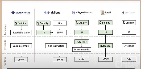 1. 编程语言层面支持,自定义 EVM 操作码,把 ZK 友好的操作抽出来重新设计新的、架构不同的虚拟机,通过编译器将 Soilidity 编译成新的虚拟机操作码