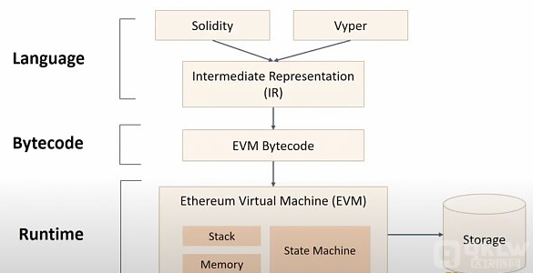 EVM 指的是以太坊虚拟机(Ethereum Virtual Machine),它相当于执行引擎,是以太坊智能合约的运行时环境(Runtime)。开发者通过高级编程语言如 Solidity 编写业务逻辑,然后编译器把代码编译成低级编程语言字节码(bytecode),EVM 再把字节码解析成机器可读指令即操作码(opcode)并执行相应指令修改系统状态。EVM 是基于堆栈结构的虚拟机(stack machine),在执行opcode的时候需要和stack、memory、storage交互。