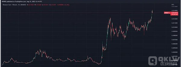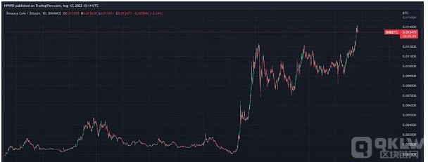 这就是时间的复利价值,然而加密货币似乎根本没有从这种动态中获益,而且受到了相反的影响。由于几乎所有加密项目的支出都超过收入,因此它们必须通过增发货币产生资金来弥补其负净收入。因此,除非收益增长或其倍数扩大,否则每个代币的价格都会下降。最值得注意的是 BNB,它是目前唯一一个收入超过支出的 L1 代币。下图可见,BNB/BTC 大多数情况下处于上涨趋势且在最近突破了上一个最高点。