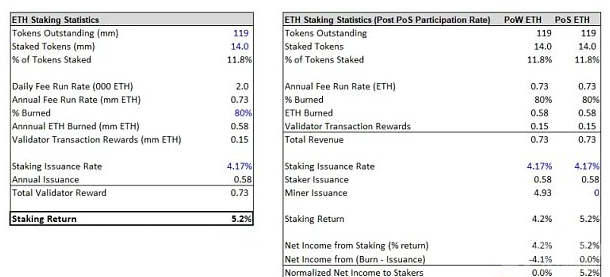 合并后质押率将从 4.2% 增加约 100 个基点至 5.2%,但这并不意味着实际收益率有效增长。为了充分理解这种转变,我们必须评估实际收益率而不是名义收益率。由于每年发行 4.4% 的 ETH,所以虽然目前的应计收益率是 4.2%,实际收益率接近 0%。但是当合并之后,质押率增加到约 5%,这将在很大程度上创造加密货币的最高实际收益率。唯一可以与之比较的就是实际收益率为 1% 的 BNB。