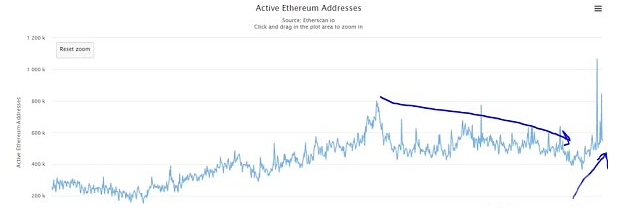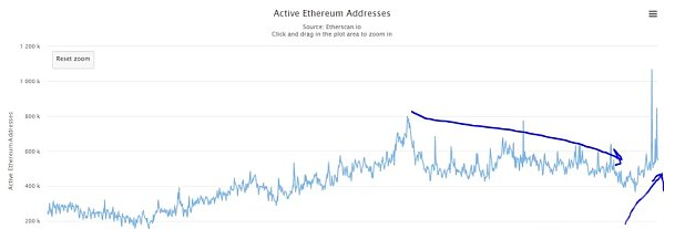 自从去年 12 月份以来,以太坊价格已经经历大幅下降,但六月下旬以来活跃用户已经出现了稳定的上升趋势。
